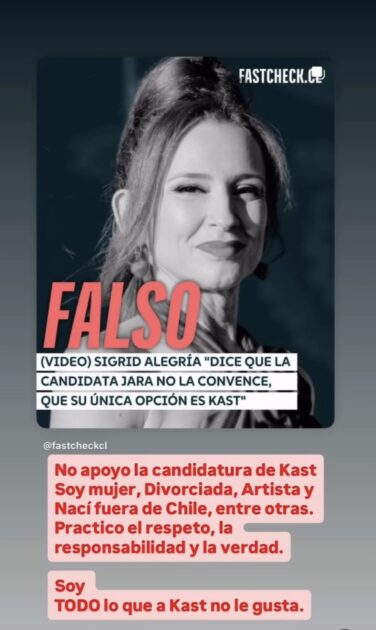 “Soy mujer, divorciada, artista, nací fuera de Chile, entre otras cosas (…) Soy todo lo que a Kast no le gusta”, afirmó Sigrid Alegría en sus redes sociales.