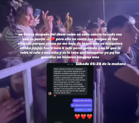 “Hasta tuve que salir persiguiendo a un kl (sic) que le robó el celu a una niña”, escribió en una historia de Instagram.