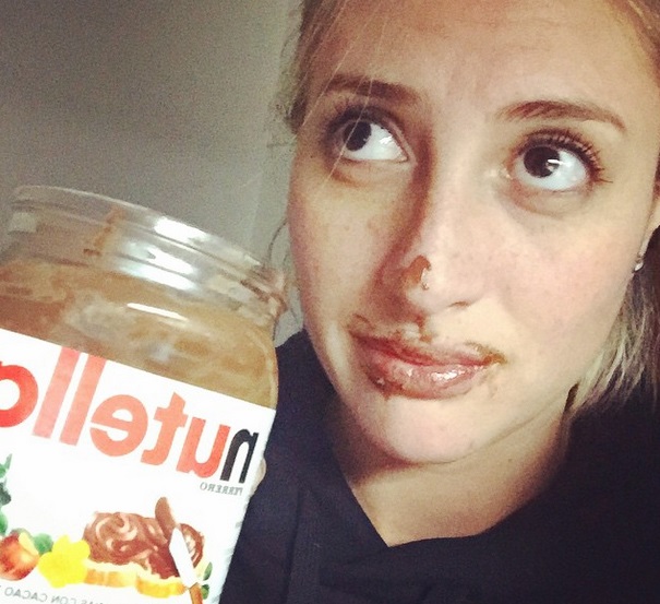 Devorando un frasco de la riquísima crema de avellanas y cacao, más conocida como Nutella, se le ve feliz de la vida y manchada a la popular cantante nacional.