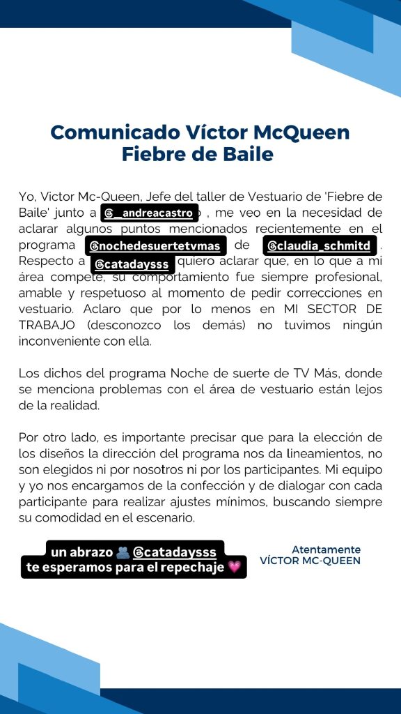 “Yo, jefe del taller de vestuario de Fiebre de Baile, junto a Andrea Castro, me veo en la necesidad de aclarar algunos puntos mencionados recientemente en el programa Noche de Suerte, de TV+, por Claudia Schmitd”, comenzó escribiendo.