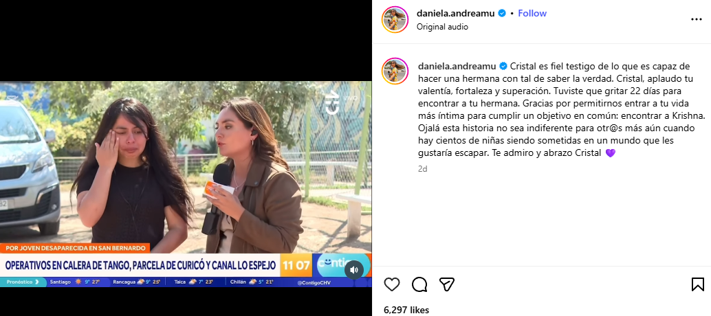 “Tuviste que gritar 22 días para encontrar a tu hermana. Gracias por permitirnos entrar a tu vida más íntima para cumplir un objetivo en común: encontrar a Krishna (…) Te admiro y abrazo, Cristal”, escribió en un post, el que acompañó con imágenes de un despacho en donde ambas se quebraron en vivo.