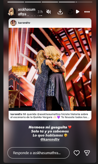 A través de sus historias de Instagram, Sumathra compartió la publicación de Karen y añadió un texto que ha zanjado cualquier duda sobre un posible conflicto: “Hermosa, mi guagüita. Solo tú y yo sabemos lo que hablamos, @karendtv”.