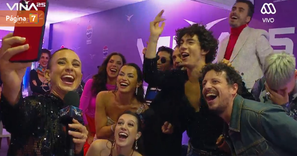 En ese contexto, la comunicadora a cargo del backstage de Viña 2025 alzó su celular para tomar la selfie junto al jurado.