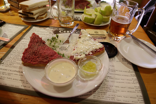 Para algunos puede sonar chocante o hasta poco higiénico ir a un local a comer carne cruda, pero si existe una ciudad que se especializa en ese plato, es Valdivia. Se trata de una tradición alemana que consiste en servir la carne aliñada y sin cocer sobre unas tostadas; a esto se le agrega cebolla y distintas salsas de mayonesa, ají o yogur -lo cual varía según el restaurante que visitas-.