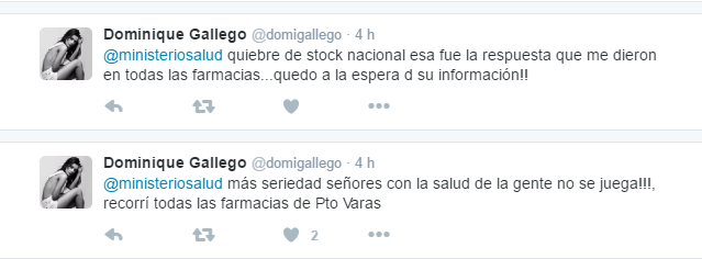 Pero las cosas para Dominique seguían de mal en peor, ya que uno de los remedios que debe tomar es Tamiflu, el que se encuentra agotado en Puerto Varas, lugar donde actualmente reside con su pareja. “No hay TAMIFLU en Pto Varas x quiebre d Stock a nivel nacional, que hacemos los q tenemos influenza H1N1 @ministeriosalud?” (sic) escribió en la red social del pajarito celeste.