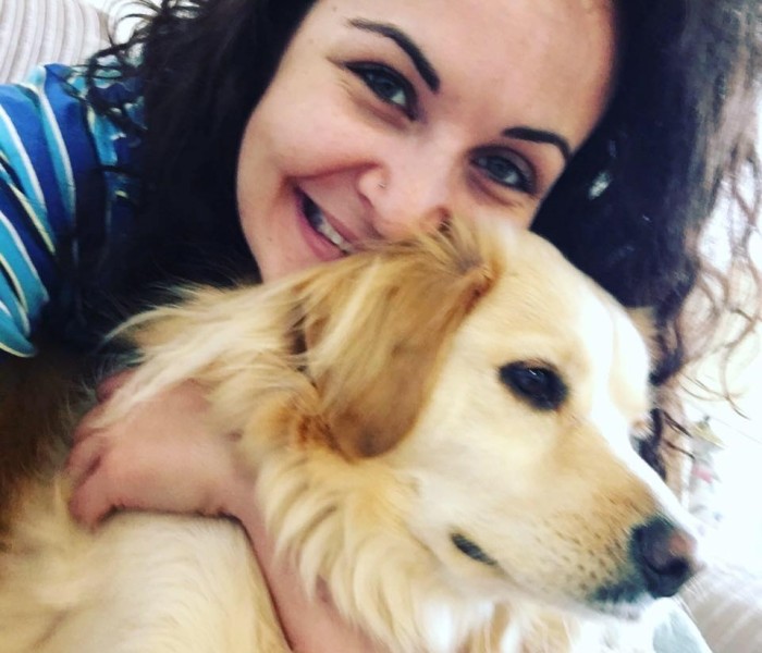 “¡Despertarme con esta belleza toda la semana es mi parte favorita de volver a casa! Sandy nació en México, se crió en California y ahora está jubilado en Escocia. Se llama así por su pelo dorado, que me recordaba mi amor por las playas de Hawaii y, por supuesto, a San Diego, el condado en el que creció. Ha estado conmigo en el infierno y más allá. Me dio motivos para salir de la cama durante mis momentos más oscuros. Me sentiré siempre en deuda con él, pero mis padres le dan una casa en Escocia que yo no puedo darle después de haber salido de un matrimonio de abusos. Él es un perro muy especial”.