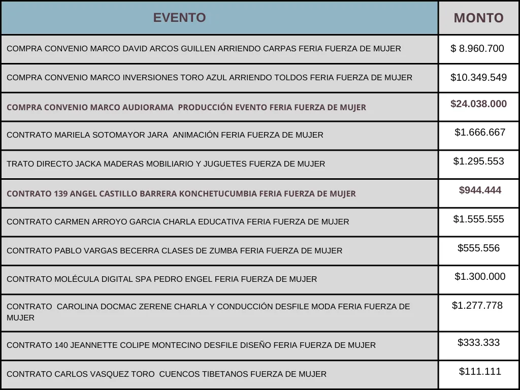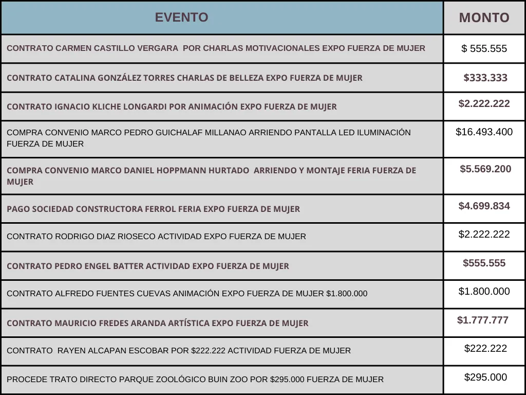 Uno de los desembolsos más altos fue en mayo de ese año, cuando se aprobó una orden de compra por más de $16 millones a favor de Pedro Guichalaf, encargado del arriendo de iluminación, pantallas LED y escenarios para una nueva edición de la Expo Fuerza de Mujer.