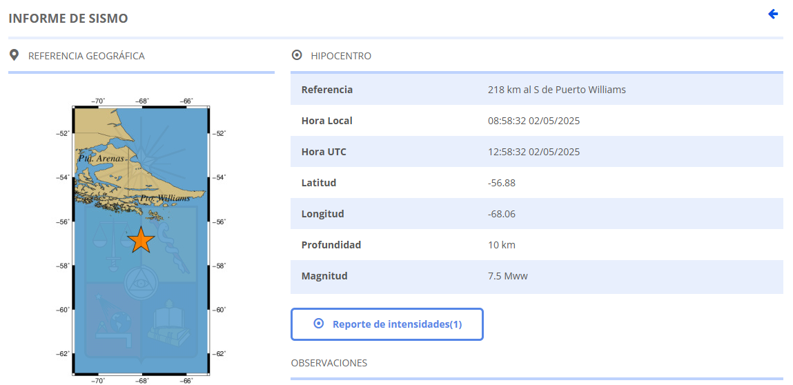 De acuerdo a información preliminar del Centro Sismológico Nacional (CSN), el sismo se registró a las 08:58 de la mañana, con epicentro a 218 km al sur de Puerto Williams. Su profundidad fue de 10 km.