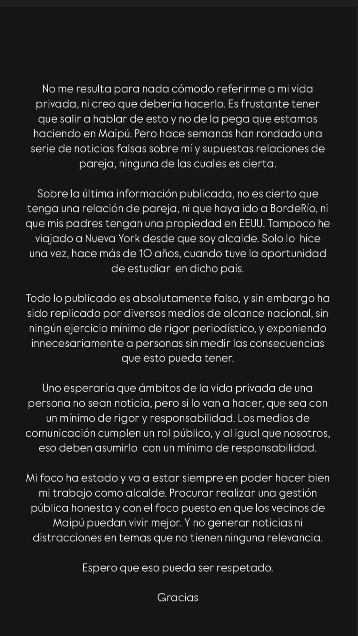 A través de Instagram, compartió una declaración: "No me resulta para nada cómodo referirme a mi vida privada, ni creo que debería hacerlo. Es frustrante tener que salir a hablar de esto y no de la pega que estamos haciendo en Maipú. Pero hace semanas han rondado una serie de noticias falsas sobre mí y supuestas relaciones de pareja, ninguna de las cuales es cierta".