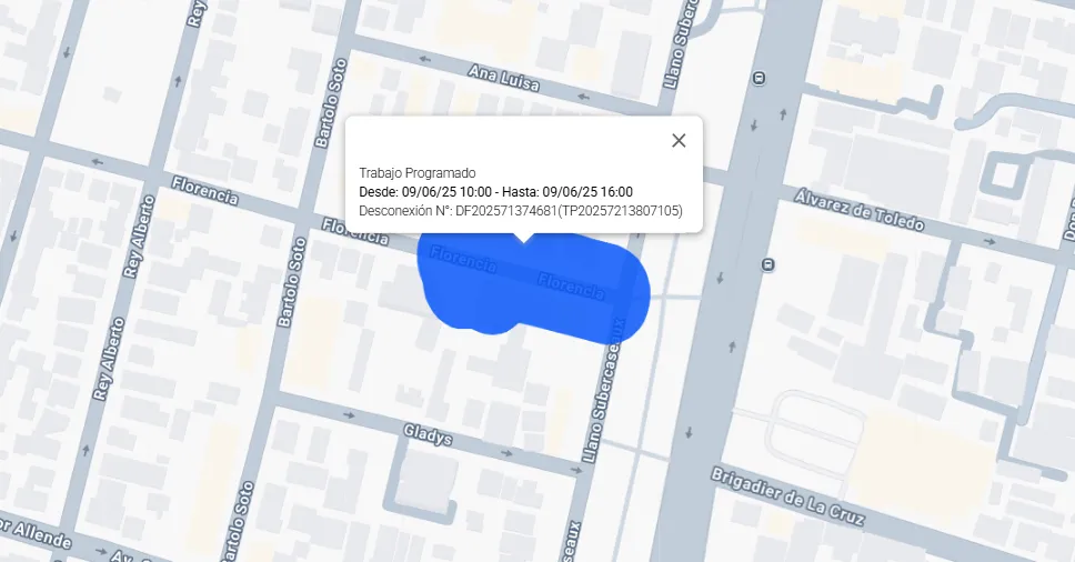 Durante la jornada del domingo, la empresa publicó un mapa que detalla las zonas afectadas en cinco comunas de Santiago.