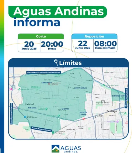 El corte comenzará el viernes 20 de junio a las 20:00 horas y se extenderá hasta el domingo 22 de junio a las 08:00 horas, afectando a las siguientes comunas: