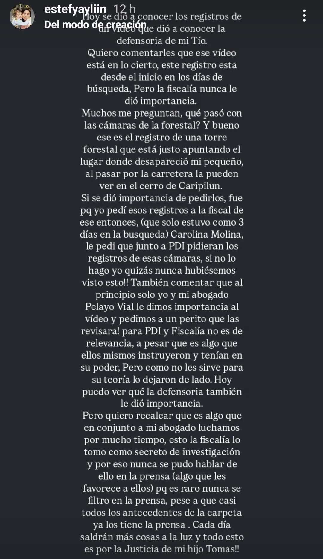"Muchos me preguntan qué pasó con las cámaras de la forestal. Bueno, ese es el registro de una torre forestal que está justo apuntando al lugar donde desapareció mi pequeño. Al pasar por la carretera la pueden ver en el cerro de Caripilún", agregó.