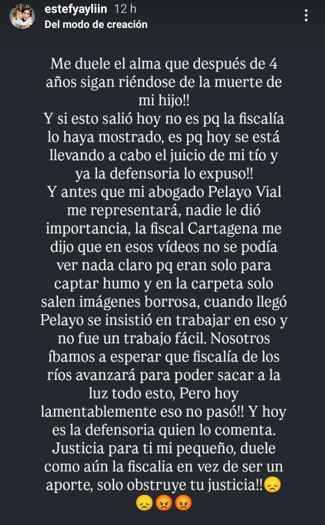 "Justicia para ti, mi pequeño. Duele cómo aún la Fiscalía, en vez de ser un aporte, solo obstruye tu justicia", cerró.