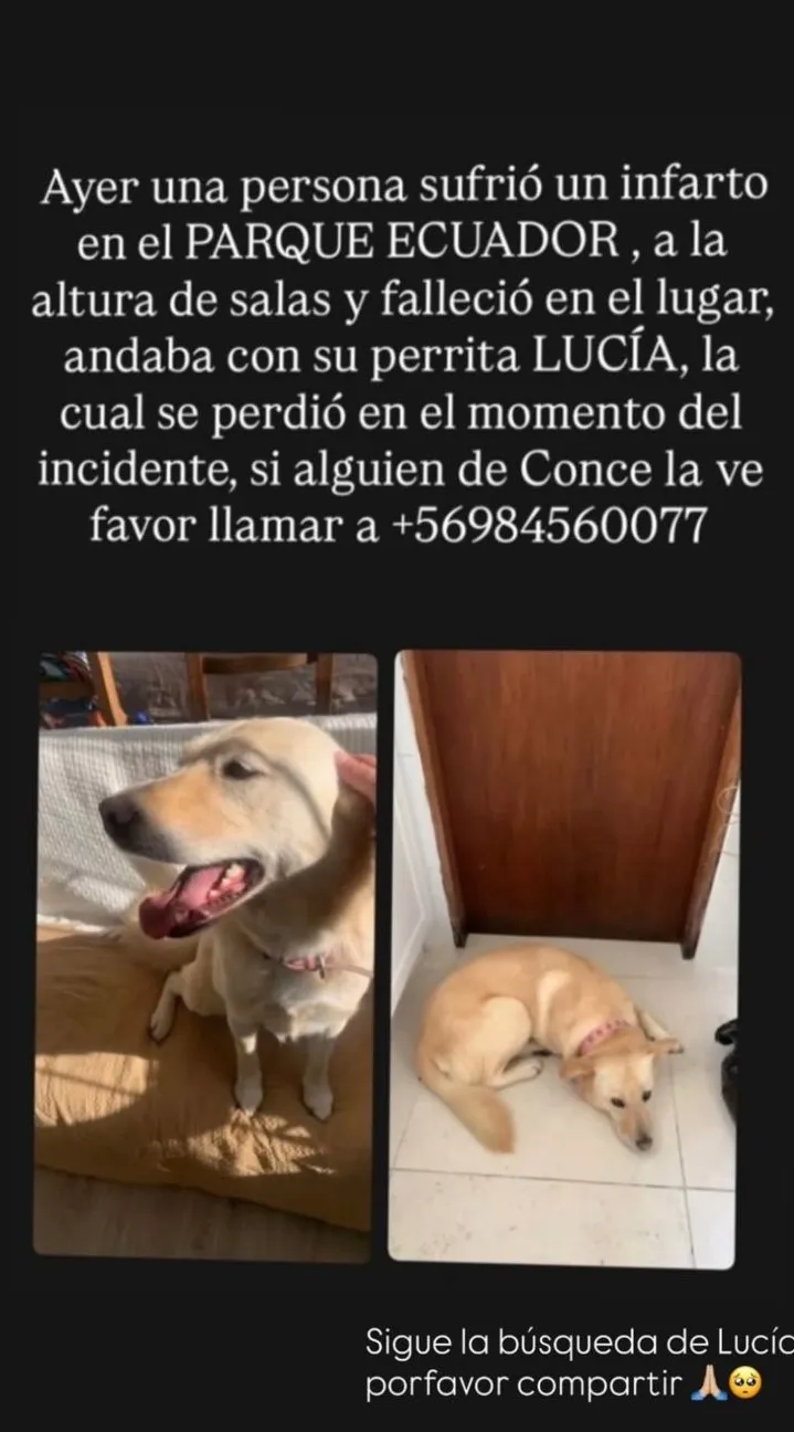 "Ayer una persona sufrió un infarto en el Parque Ecuador, a la altura de Salas, y falleció en el lugar. Andaba con su perrita, Lucía, la cual se perdió en el momento del incidente", señaló la madre de una de sus alumnas, quien además compartió un número de contacto para facilitar su búsqueda.