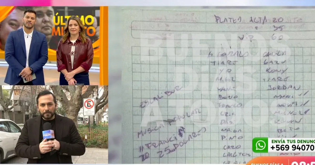 El matinal Buenos días todos presentó en exclusiva el cuaderno del 'Rey de Meiggs' con nombres de deudores, vinculando a Wilson Verdugo como autor intelectual del asesinato de José Felipe Reyes Ossa. Se destaca que el animador Francisco Kaminski y el artista Luis Lambis figuran entre los deudores, con Kaminski confirmando una deuda inferior a $50 millones. El documento incluye apodos como 'Cazely' y 'Tuto', siendo periciado por la policía en manos de la Fiscalía, revelando deudas millonarias como la de Wilson por $112 millones.