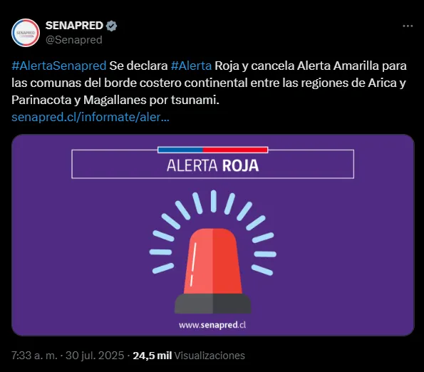 El Senapred declaró Alerta Roja y canceló la Alerta Amarilla en las comunas del borde costero continental, manteniendo el Estado de Alerta para varias regiones, incluyendo Arica y Parinacota, Tarapacá, y Los Lagos. La activación de la Alerta Roja implica la movilización de recursos para hacer frente a la situación. Se convocó al Comité de Gestión del Riesgo de Desastres Nacional y las Direcciones Regionales activaron sus COGRID respectivos.