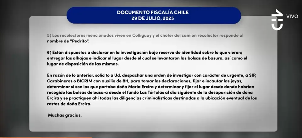 “Estimado fiscal: Hemos tomado conocimiento por personas cercanas y confianza que: 1) el día siguiente de la desaparición de la sra. Ercira desde el Fundo Las Tórtolas, el camión recolector de basura pasó por el fundo a recoger los desechos del lugar”, señala una solicitud que se emitió el 29 de julio a la Fiscalía.