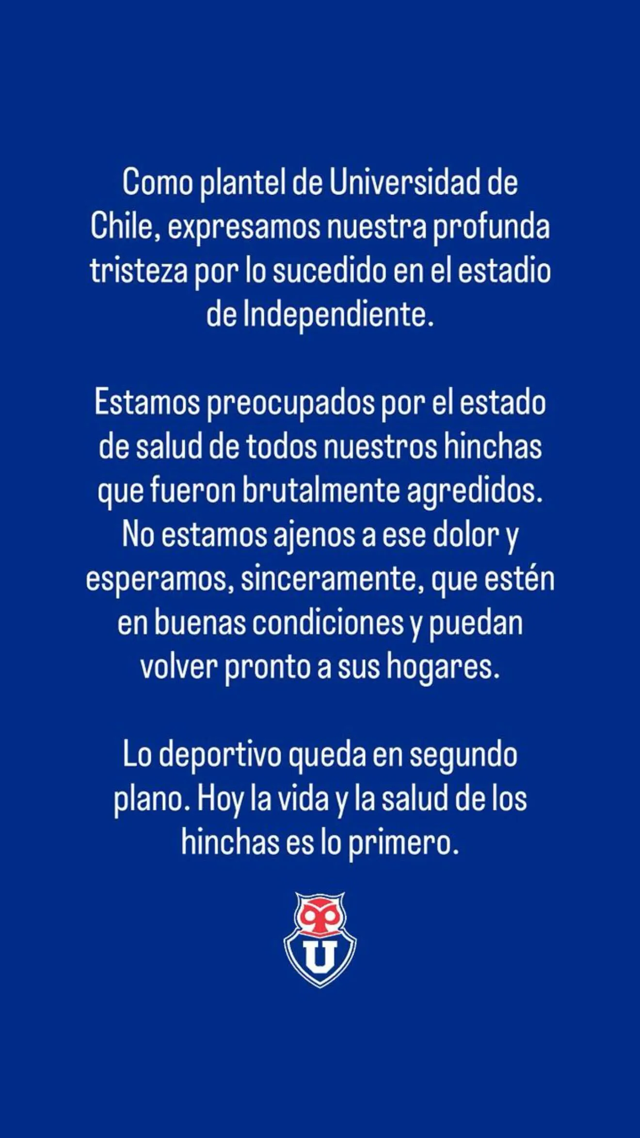 "Como plantel de Universidad de Chile, expresamos nuestra profunda tristeza por lo sucedido en el estadio de Independiente”, parte señalando el escrito que también compartió Marcelo Díaz.
