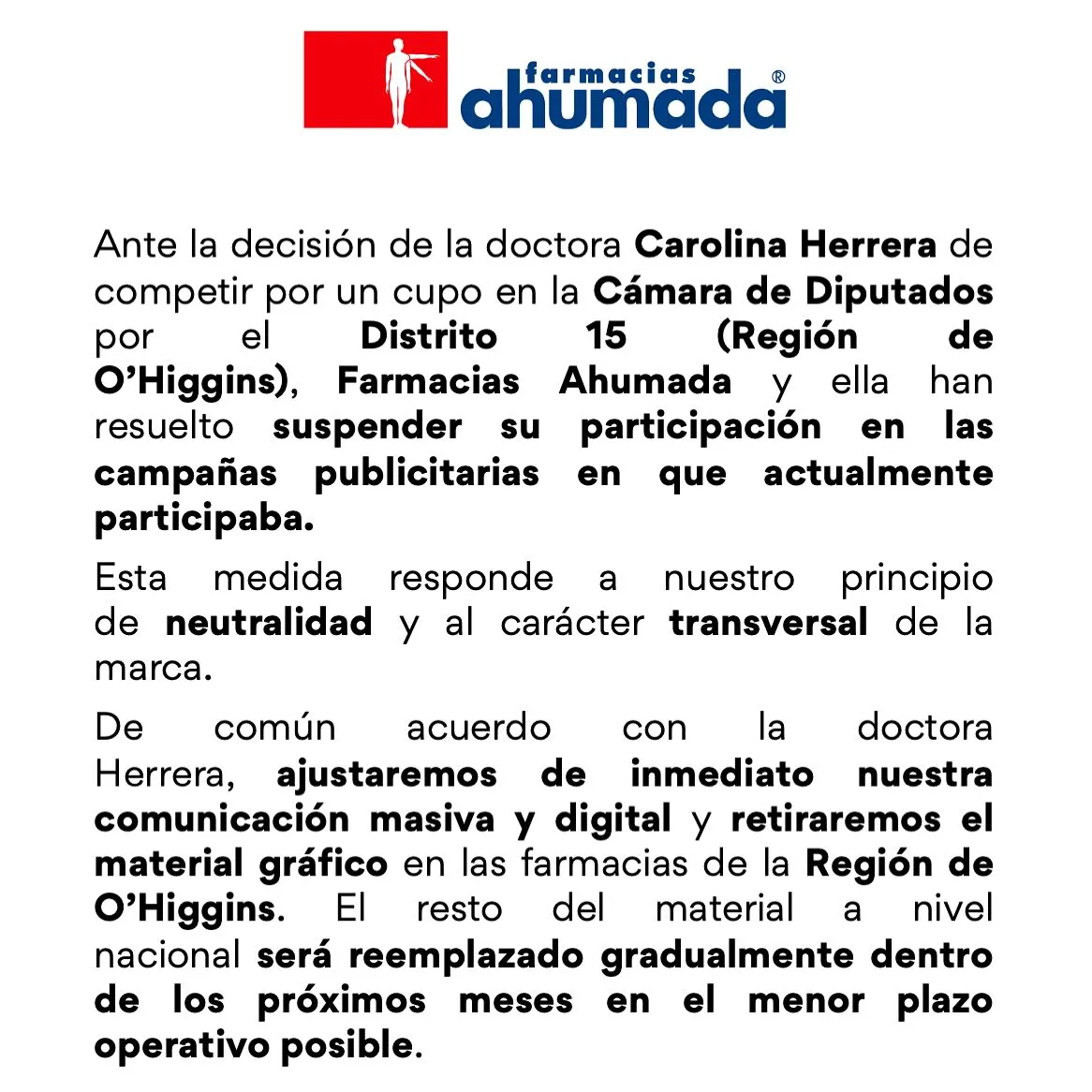 "Ante la decisión de la doctora Carolina Herrera de competir por un cupo en la Cámara de Diputados por el Distrito 15 (Región de O’Higgins), Farmacias Ahumada y ella han resuelto suspender su participación en las campañas publicitarias en que actualmente participaba", explicaron.