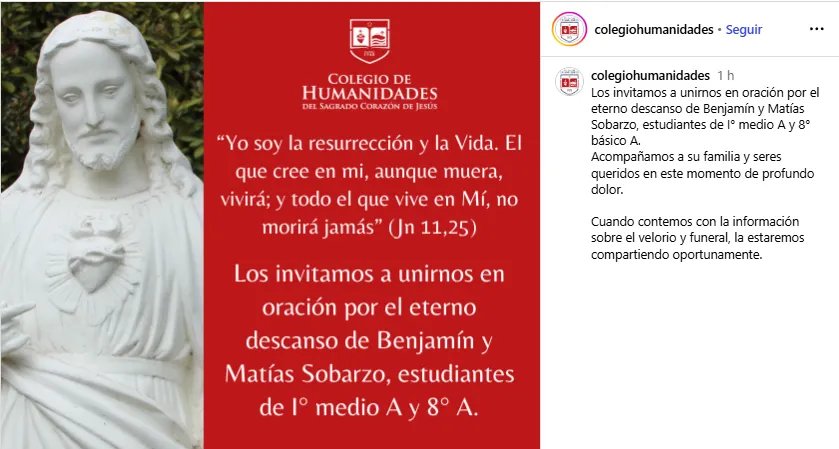 Desde el recinto educacional donde estudiaban los niños, invitaron a la comunidad "a unirnos en oración por el eterno descanso de Benjamín y Matías Sobarzo, estudiantes de I° medio A y 8° básico A. Acompañamos a su familia y seres queridos en este momento de profundo dolor".
