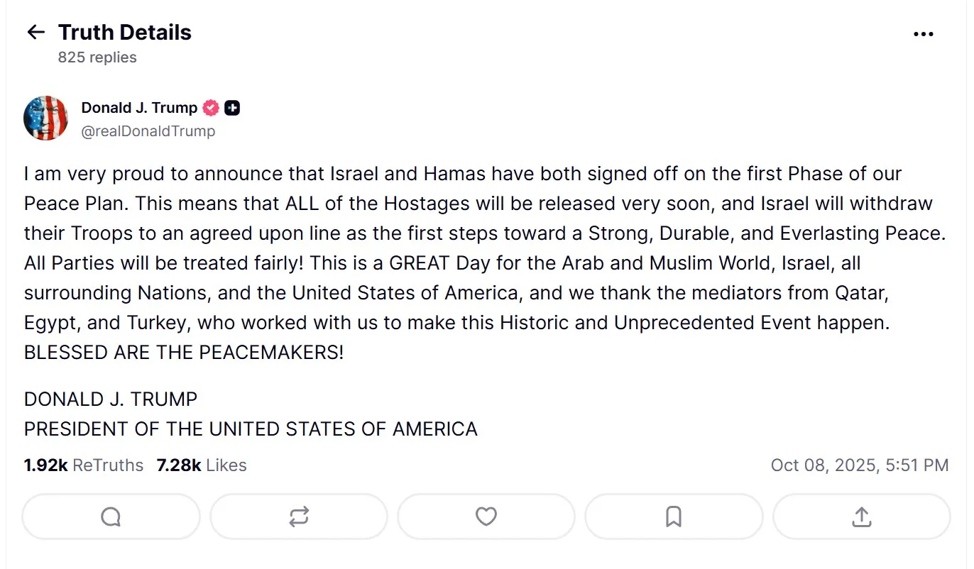 Trump dijo en su cuenta oficial de la red social Truth que esto significa que "Israel retirará sus tropas a una línea acordada como primeros pasos hacia una paz sólida, duradera y eterna" y que "TODOS los rehenes serán liberados muy pronto".