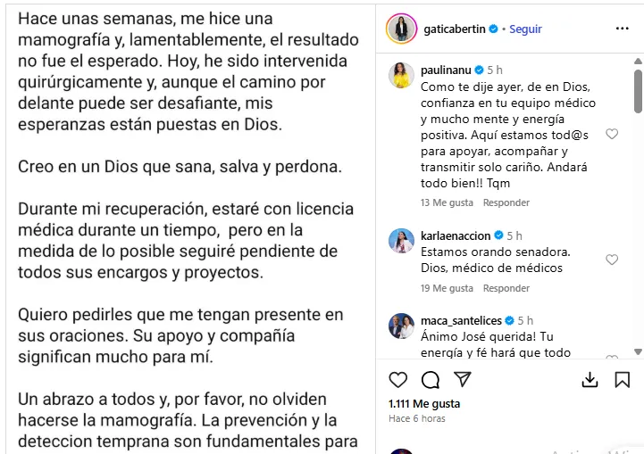 La senadora María José Gatica anunció en redes sociales que le fue diagnosticado cáncer, motivo por el cual se tomará licencia médica para recibir tratamiento. Tras una cirugía, expresó su fe en Dios y pidió a sus seguidores que la tengan presente en sus oraciones. También instó a las mujeres a realizarse mamografías para la detección temprana de esta enfermedad.
