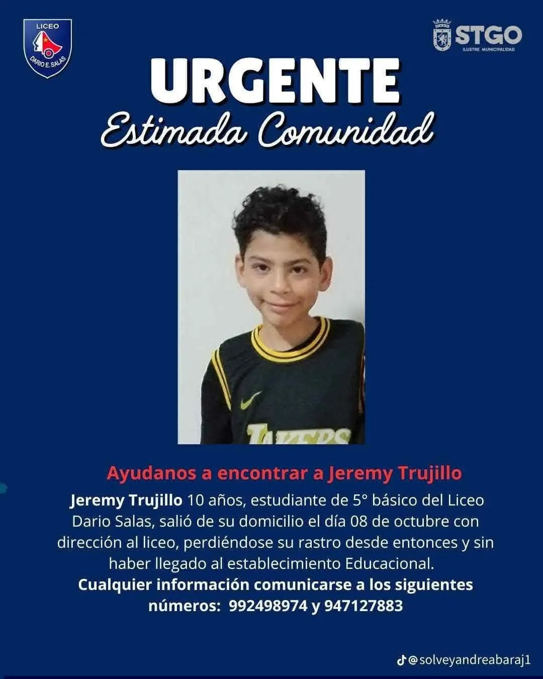 Un niño de 10 años, Jeremy Trujillo, desapareció en Estación Central cuando se dirigía al colegio el pasado miércoles 8 de octubre. Su madre, Linda, está angustiada y sospecha que la abuela del niño podría estar involucrada, ya que no ha logrado contactarla. Jeremy es descrito como un niño tranquilo y amoroso, lo que agudiza la preocupación por su paradero. Carabineros y la Policía de Investigaciones se encuentran buscándolo, en medio de un ambiente de incertidumbre y desesperación por parte de la familia.
