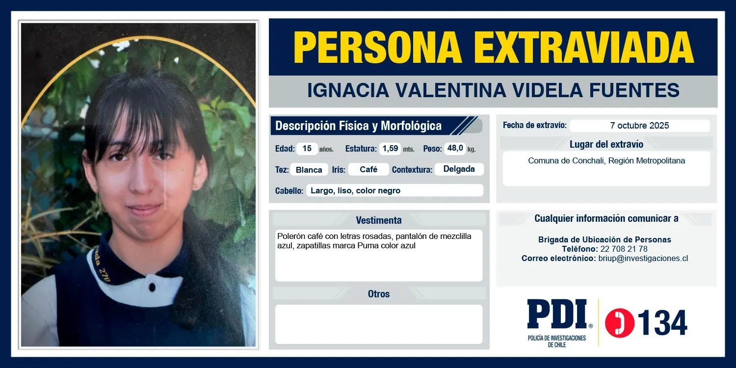 Una angustiosa búsqueda tiene en vilo a la familia de Ignacia Videla Fuentes, una adolescente de 15 años desaparecida desde el 7 de octubre en Independencia, región Metropolitana. La madre, Katherine Fuentes, indicó que la joven salió de casa y se perdió su rastro, sospechando que pudo ser contactada por un hombre adulto de nacionalidad boliviana. La familia pide ayuda a los medios y la comunidad para difundir la búsqueda de Ignacia, quien vestía un polerón café, pantalón de mezclilla azul y zapatillas Puma al desaparecer.