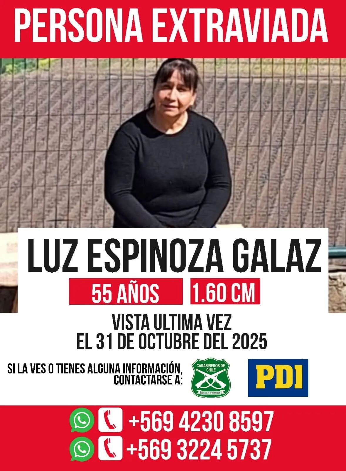 Una intensa búsqueda se lleva a cabo en Malloa, región de O'Higgins, para encontrar a Luz Espinoza Galaz, una mujer de 55 años desaparecida desde el viernes 31 de octubre. Su familia y autoridades trabajan para dar con su paradero, luego de que no se presentara a su trabajo el domingo 2 de noviembre. La alarma se encendió cuando su sobrina, y compañera de labores, no la encontró en casa. A pesar de no hallar signos de violencia, solo falta su teléfono. Vecinos, voluntarios y equipos de emergencia están rastreando la zona, mientras la Policía de Investigaciones investiga el caso.