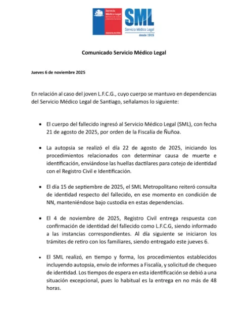 El caso de Luis Felipe Correa, estudiante de Sociología desaparecido por más de dos meses, dio un sorpresivo giro al descubrirse que su cuerpo estuvo en el Servicio Médico Legal sin notificar a la familia. Tras una autopsia realizada el día después de su ingreso, se esperó la identificación que demoró hasta el 4 de noviembre, cuando el Registro Civil confirmó su identidad. El SML defendió que siguieron los procedimientos establecidos, aunque reconocieron la demora excepcional en este caso particular.