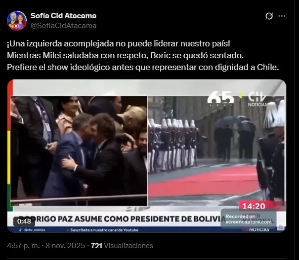 "¡Una izquierda acomplejada no puede liderar nuestro país! Mientras Milei saludaba con respeto, Boric se quedó sentado”, cerró.