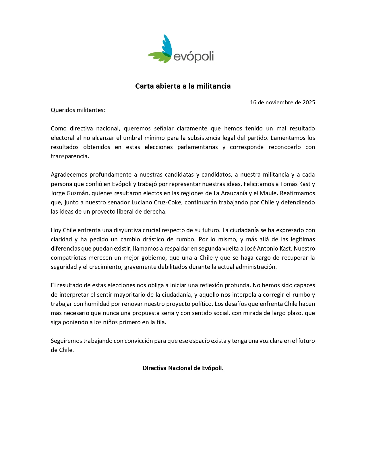 Tras las elecciones del domingo 16 de noviembre, Evolución Política (Evópoli) no alcanzó los votos mínimos para subsistir como partido, según la Ley de Partidos Políticos. A pesar de que Tomás Kast y Jorge Guzmán resultaron electos como diputados, el partido emitió un comunicado lamentando los resultados y reconociendo abiertamente su mal desempeño electoral. Evópoli agradece a sus seguidores y llama a votar por José Antonio Kast en el balotaje presidencial, destacando la importancia de un cambio de rumbo en el país. Se comprometen a seguir trabajando por un espacio claro en el futuro de Chile.