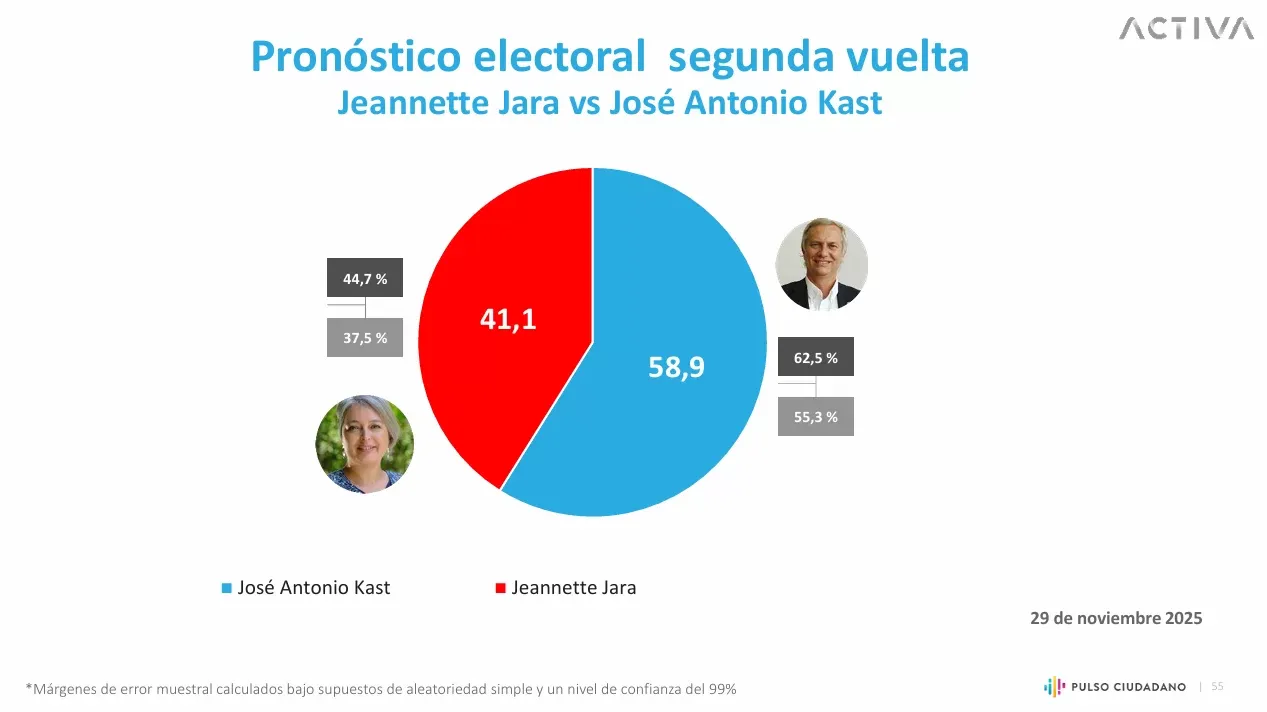 Según la Encuesta Activa Research Pulso Ciudadano, José Antonio Kast lidera las preferencias con un 58,9% de los votos válidos para la segunda vuelta presidencial de diciembre, seguido por Jeannette Jara con un 41,1%. Un 15,1% se declara "poco/nada decidido", generando incertidumbre. El 53,3% cree que Kast será el próximo Presidente, mientras que el 79% asegura estar "muy decidido" a votar. La encuesta se realizó del 26 al 28 de noviembre con 1.226 entrevistas y un margen de error de +/- 2,2%.