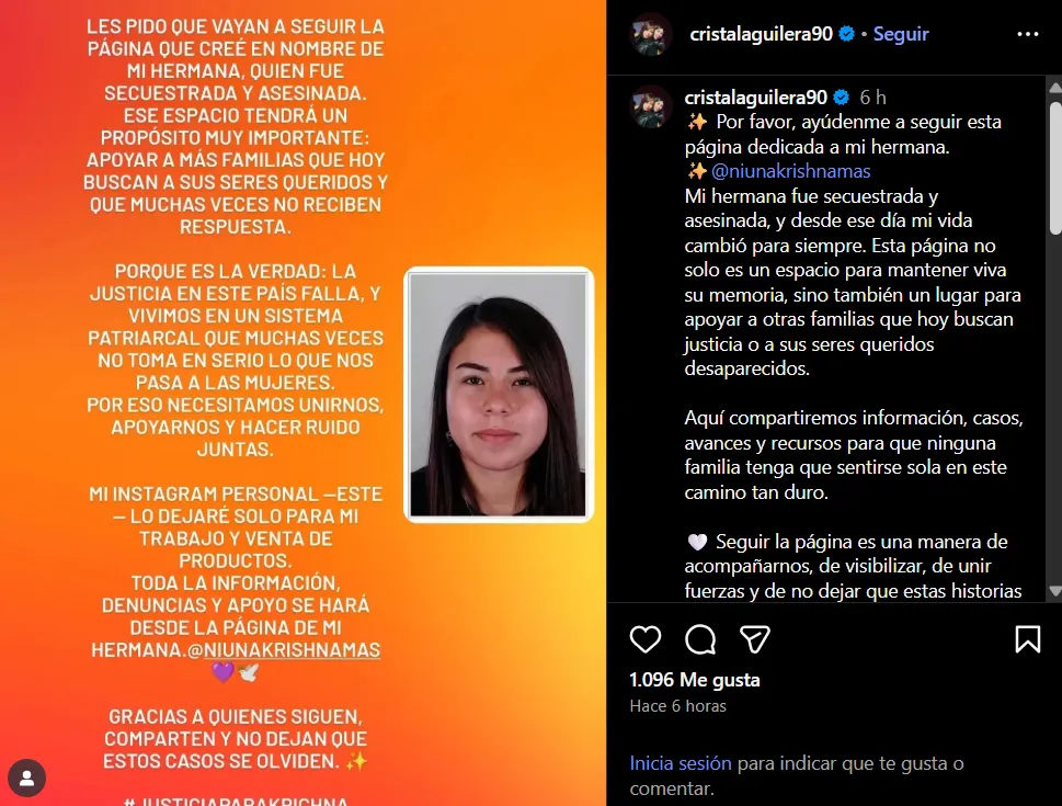 Tras esto, la joven llamó a seguir y difundir la nueva página creada en honor a su hermana: “Toda la información, denuncias y apoyo se hará desde la página de mi hermana @niunakrishnamas”, instó.