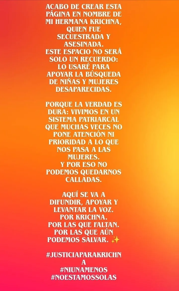 "A Krishna me la secuestraron y asesinaron y desde ese día mi vida no volvió a ser la misma”, expresó, agregando que "no existe dolor más grande que perder a alguien tan noble, tan llena de luz y con tantos sueños por cumplir”.