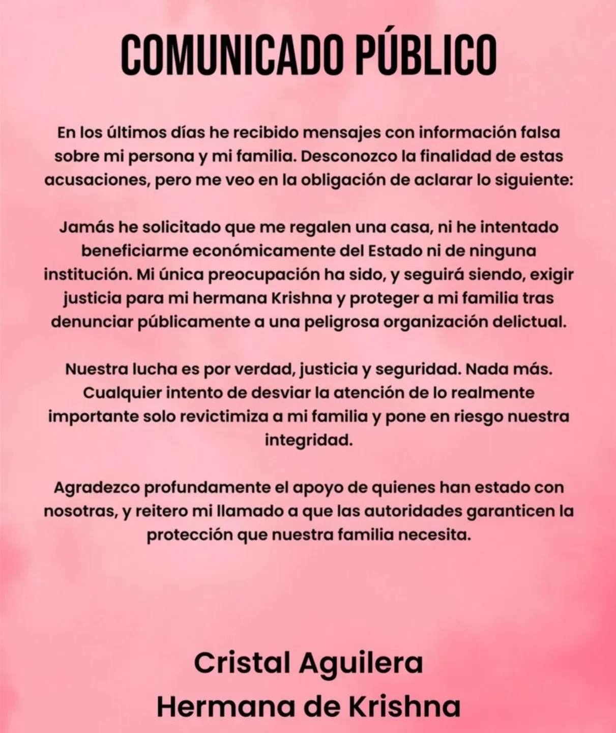 "Nuestra lucha es por verdad, justicia y seguridad. Nada más. Cualquier intento de desviar la atención de lo realmente importante solo revictimiza a mi familia y pone en riesgo nuestra integridad", añadió.