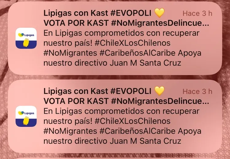 “Lipigas por Kast #Evópoli. Vota por Kast #NoMigrantesDelincuentes. En Lipigas, comprometidos con recuperar nuestro país!”, señala el texto.