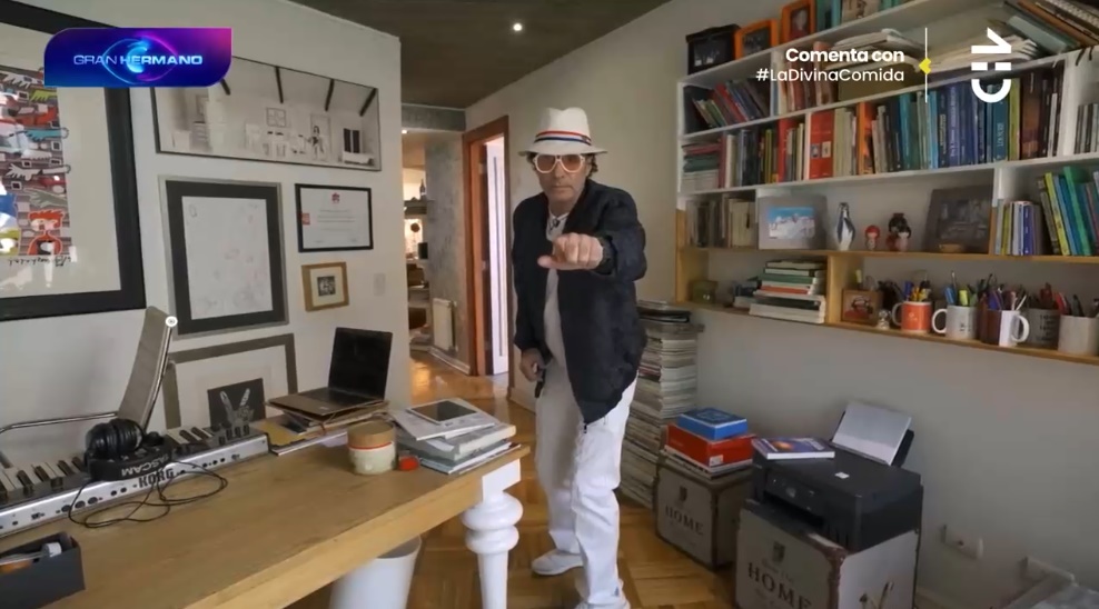 “Esta es mi biblioteca. En realidad no es mía, es de la Gaby, que ha ganado algunos premios en diseño. Aquí yo me concentro para hacer música”, explicó.