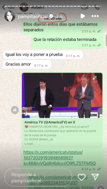 En el último chat expuesto por Pampita, se ve cuando le envió a Roberto García Moritán un artículo del medio argentino América TV sobre su ruptura, el día 20 de septiembre.