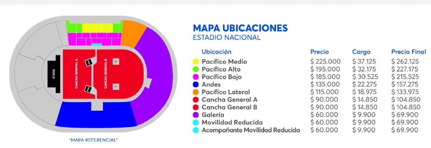 Específicamente, el precio de los tickets comienza en los 60 mil pesos para Galería y personas con Movilidad reducida, alcanzando los 225 mil pesos, más cargo por servicio.