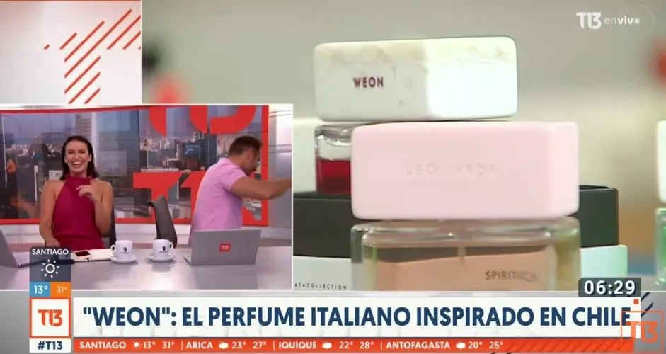 Los conductores de T13 AM, Chantal Aguilar y Francesco Gazzella, protagonizaron un divertido momento al comentar sobre el perfume WEON, creado por la empresa italiana Spiritica y vendido a 190 euros. Aguilar y Gazzella bromearon sobre los posibles usos del nombre del perfume en Chile, donde el término "hueón" tiene diferentes significados. La curiosa noticia generó risas en el programa, con los conductores debatiendo sobre la posibilidad de usar WEON y sus implicaciones.