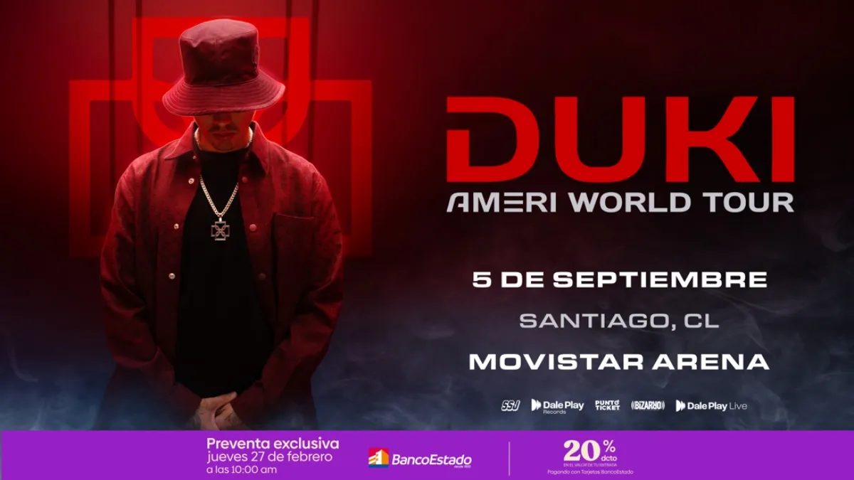 Duki trae su exitosa gira Ameri World Tour a Chile el 5 de septiembre en el Movistar Arena, siendo el primer argentino de su generación en llenar recintos de gran tamaño. Su disco AMERI, con colaboraciones de artistas internacionales, ha sido todo un éxito con más de 13.5 millones de reproducciones en su primer día. Las canciones han alcanzado los primeros puestos en los rankings de Argentina, Uruguay, España y América Latina, consolidando a Duki como el líder de su generación.