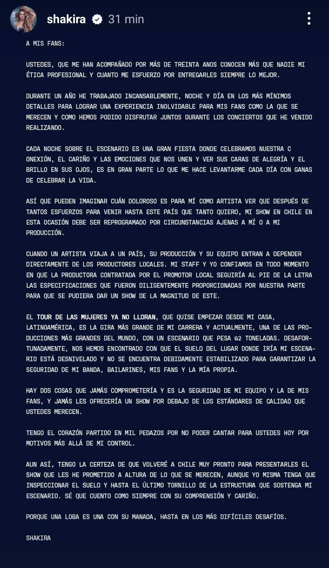 "Así que pueden imaginar cuán doloroso es para mí como artista ver que después de tantos esfuerzos para venir hasta este país que tanto quiero. Mi show en Chile en esta ocasión debe ser reprogramado por circunstancias ajenas a mí o a mi producción", declaró.