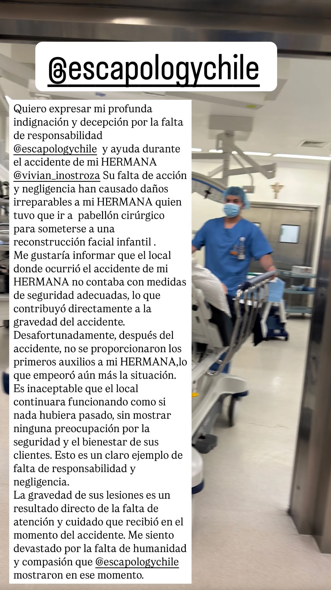 "Quiero expresar mi profunda indignación y decepción por la falta de responsabilidad Escapology Chile y ayuda durante el accidente de mi hermana Vivian Inostroza", se lee en el escrito que compartió.