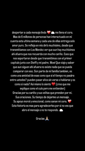 “Despertar con cada mensaje lindo me llena el ‘cora’. Más de 6 millones de personas han interactuado con mi cuenta esta última semana y cada una de ellas entrega solo amor puro”, empezó su mensaje.