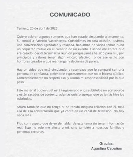A ello, sumó un comunicado que subió a su perfil de Instagram, donde reafirmó sus declaraciones respecto al supuesto encuentro con Fabricio Vasconcelos.