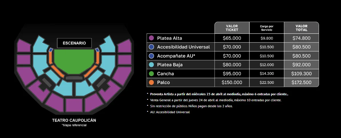 La venta general se iniciará el jueves 24 de abril a la misma hora. Los precios de las entradas oscilarán entre $74.800 y $172.000, incluyendo cargos por servicio.