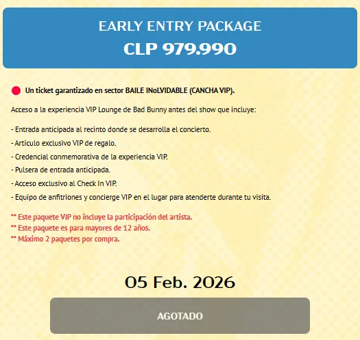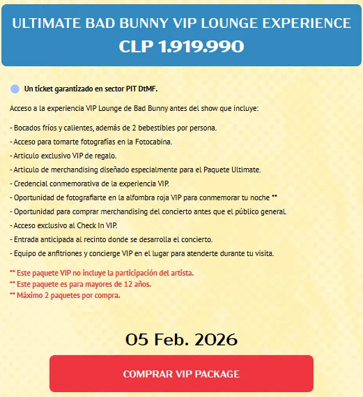 Así, llamó la atención el paquete "Ultimate Bad Bunny VIP Lounge Experience", el cual por un costo de $1.919.990 ofrecía varias comodidades.