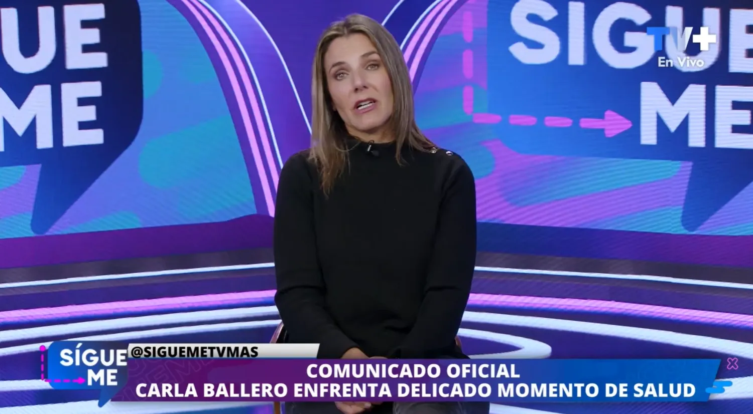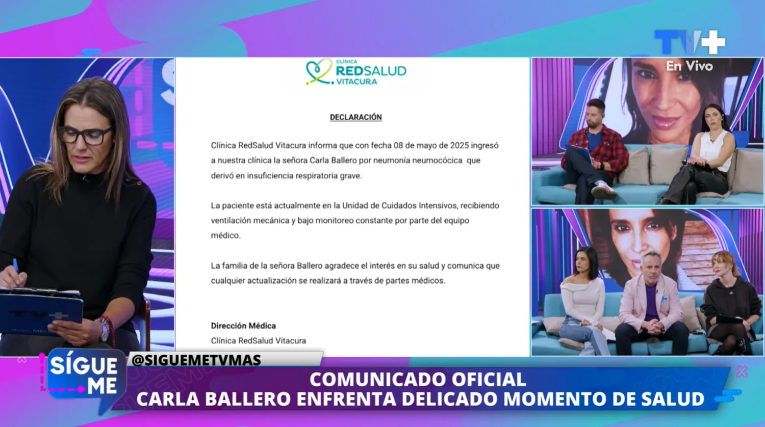 La panelista de Sígueme, Carla Ballero, se encuentra en estado grave en la Clínica RedSalud de Vitacura debido a neumonía neumocócica. Está en la Unidad de Cuidados Intensivos con ventilación mecánica. Sus compañeros de programa destacan su evolución positiva y piden no especular con su salud. La familia aprueba el comunicado médico y envía mensajes de apoyo a Ballero.