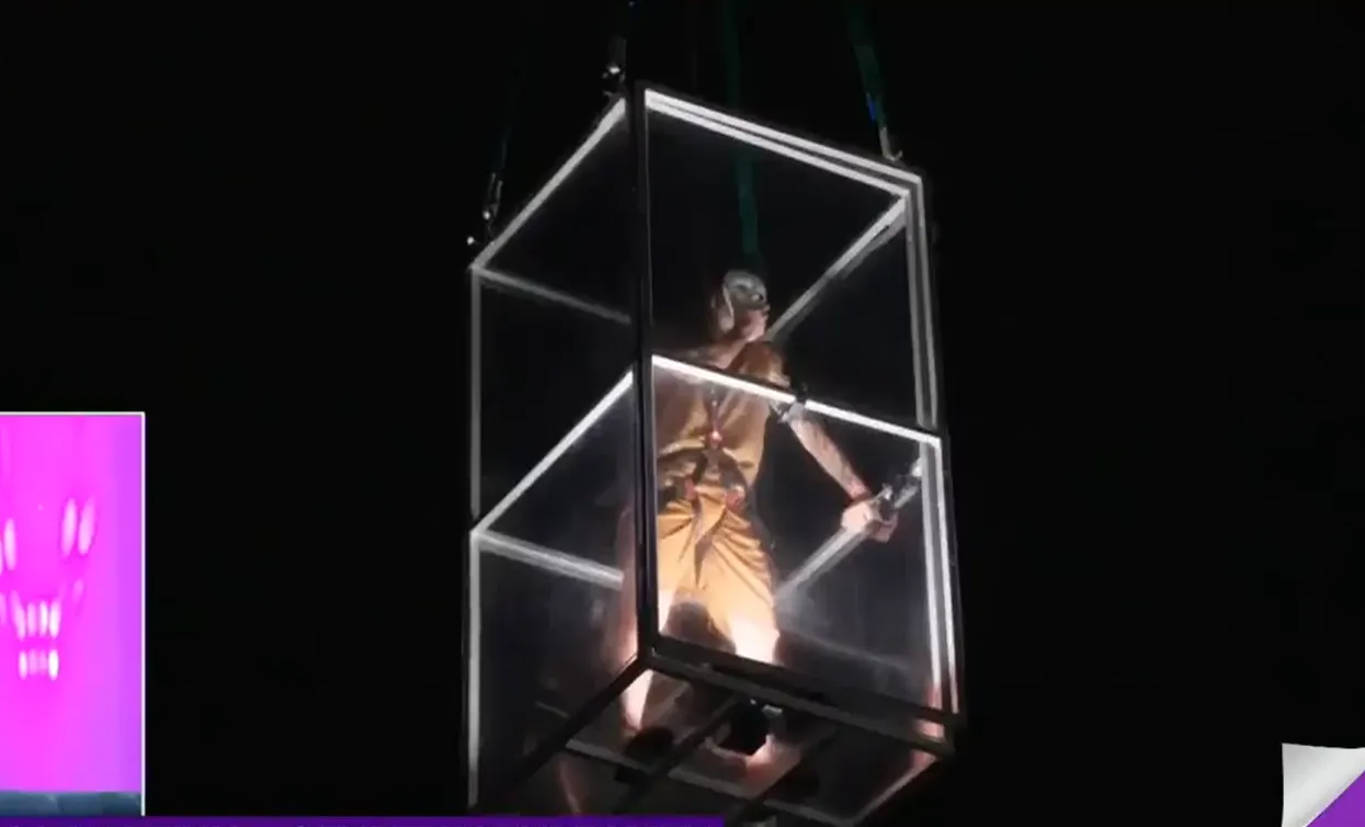 En el registro se ve al exfutbolista nacional suspendido a varios metros de altura, sobre un cubo transparente, enganchado a una grúa.